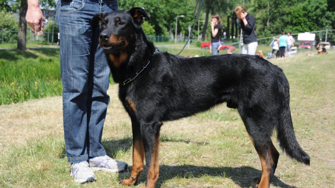 Wallpaper Serious beautiful Beauceron on the background of foliage