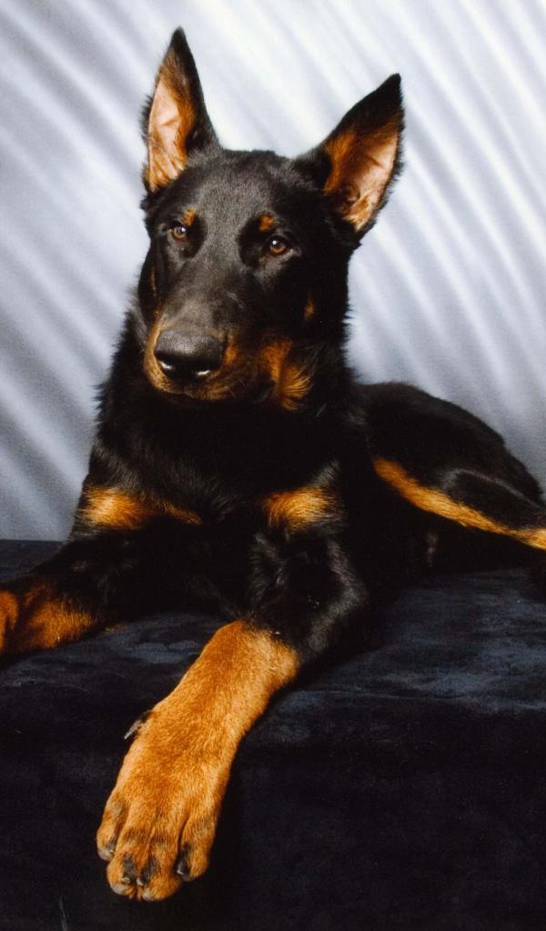 Wallpaper Serious beautiful Beauceron on the background of foliage
