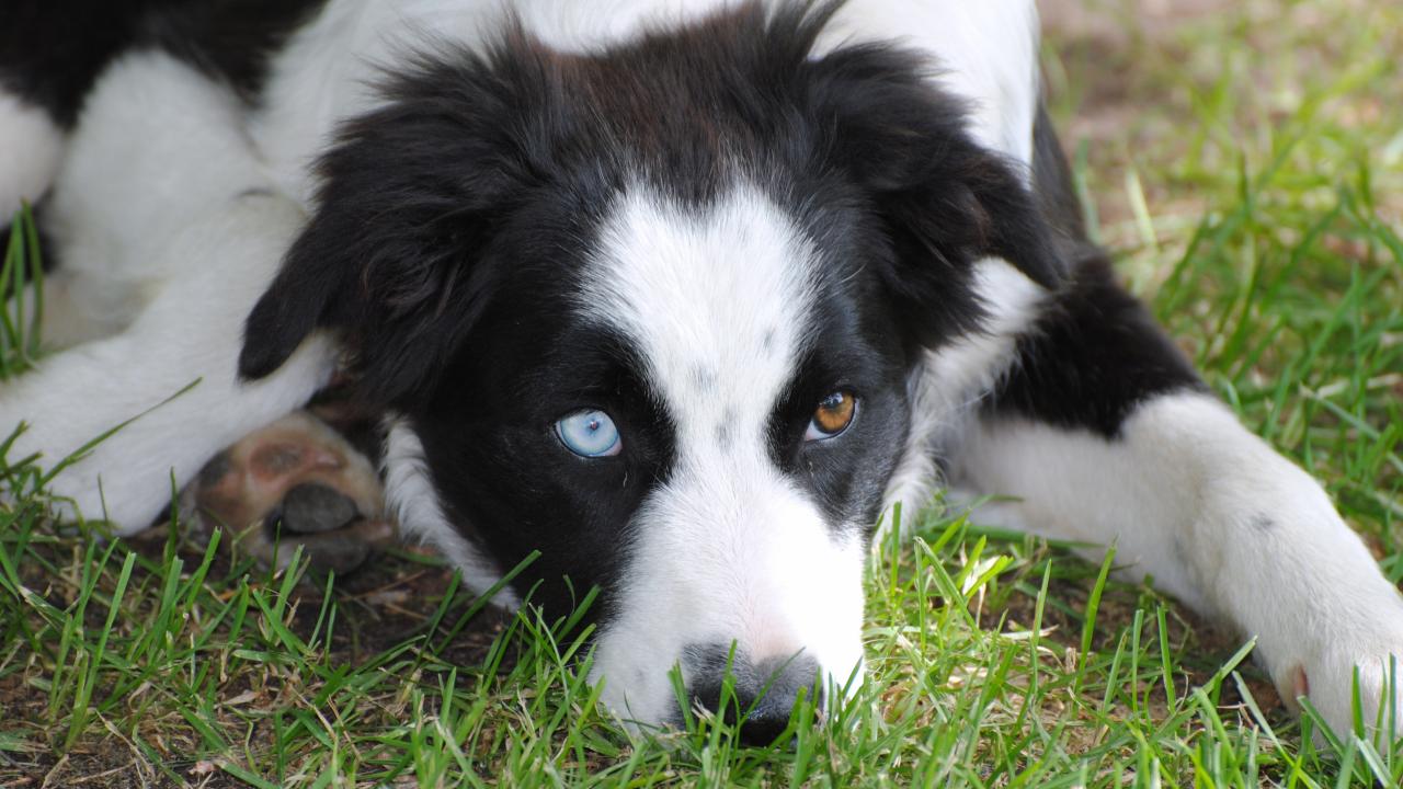 Wallpaper Border Collie with different eyes lying on the grass