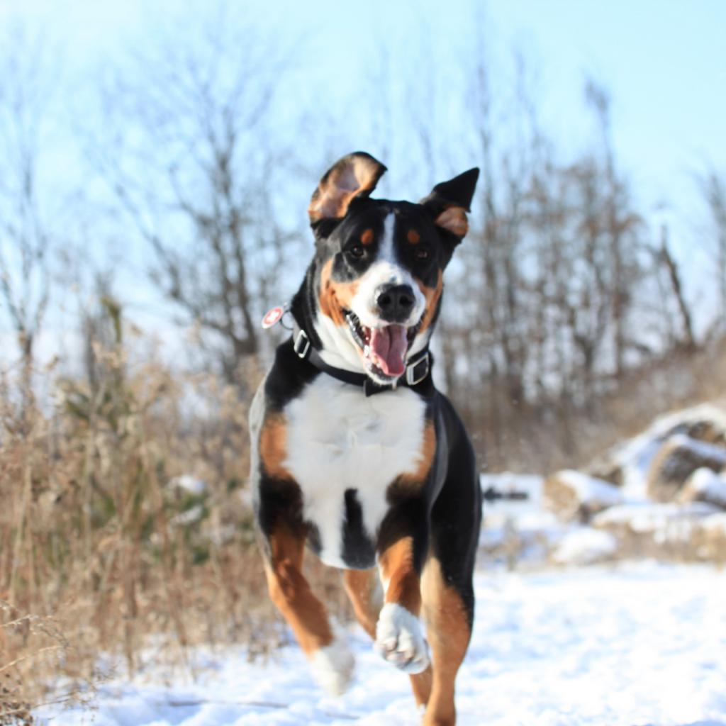 Wallpaper Happy great Swiss Mountain Dog running in the snow