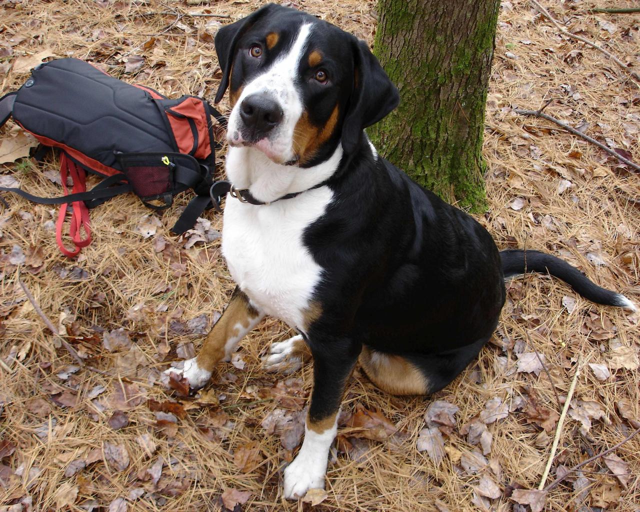 Wallpaper Greater Swiss Mountain Dog near a tree in autumn