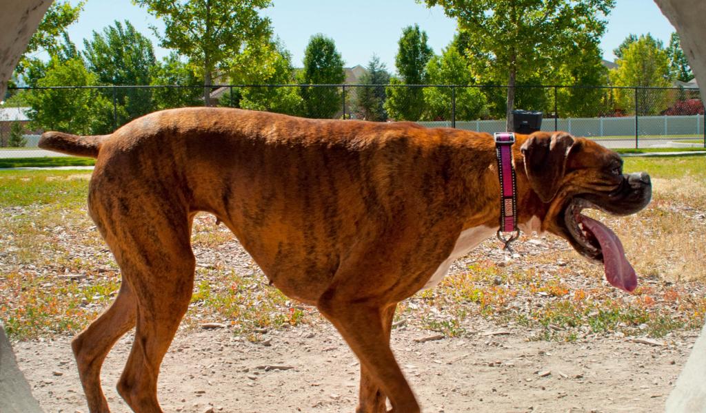 Wallpaper Boxer with a long tongue is walking through the grass