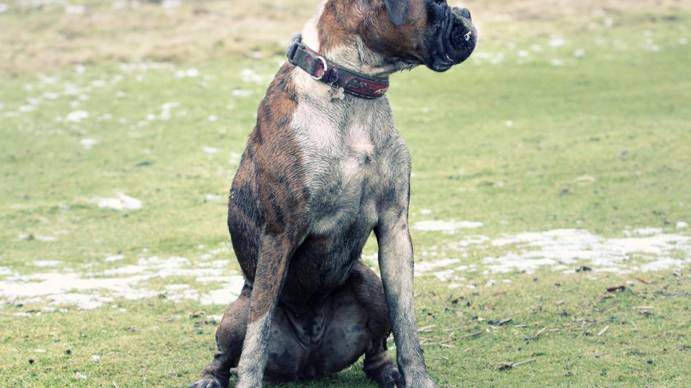Wallpaper Sad puppy boxer sitting on the sidewalk