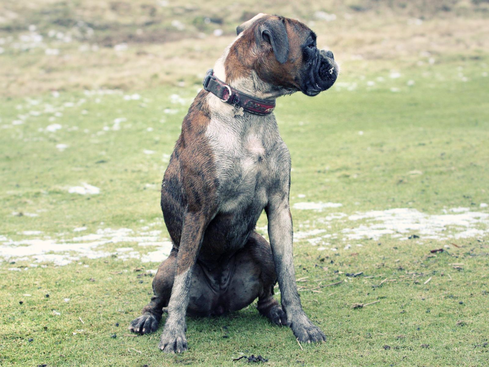 Wallpaper Sad puppy boxer sitting on the sidewalk
