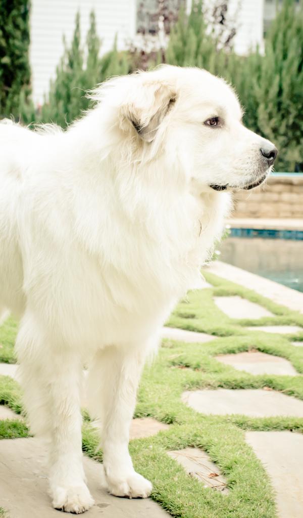 Wallpaper Great Pyrenees dog stands near the pool