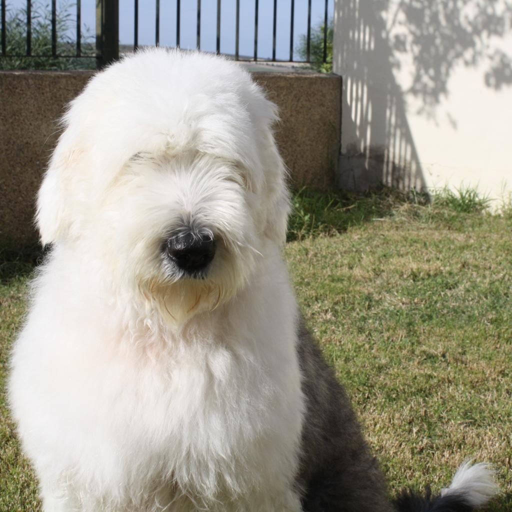 Wallpaper Dog breed bobtail sitting in the yard