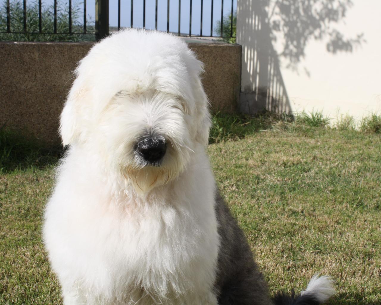 Wallpaper Dog breed bobtail sitting in the yard