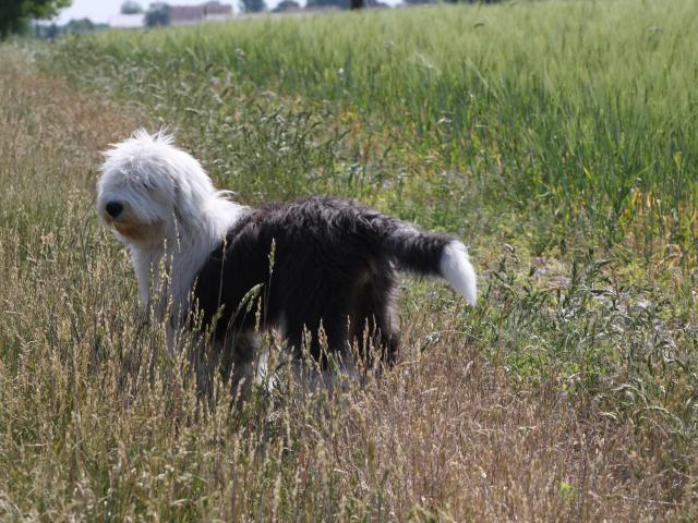 Wallpaper Dog breed bobtail running in field