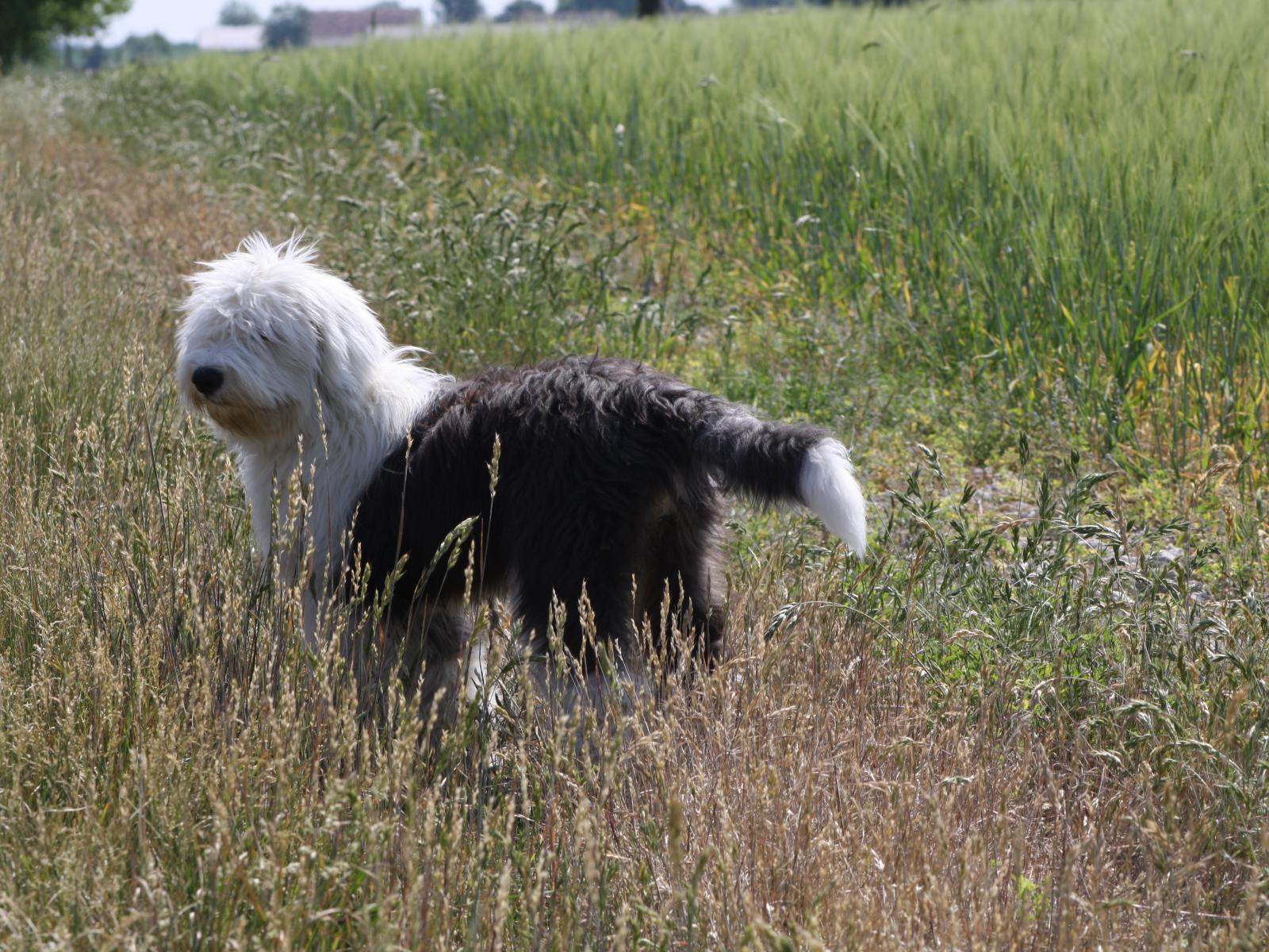 Wallpaper Bobtail dog breed stands in a field