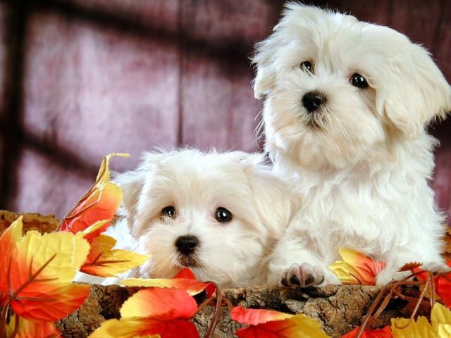 Wallpaper Two dogs of breed Bichon Frise in autumn leaves