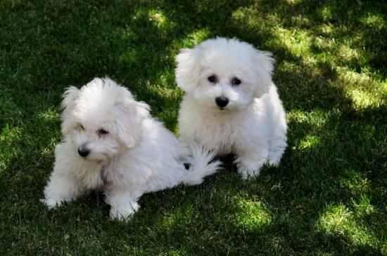 Wallpaper Two dogs of breed Bichon Frise rest on the grass