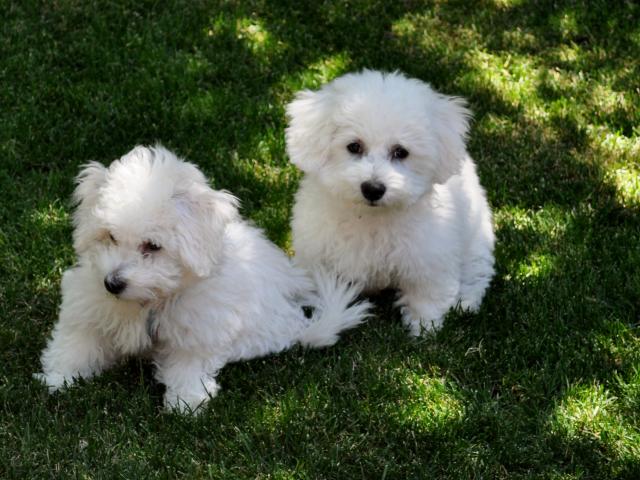 Wallpaper Two dogs of breed Bichon Frise rest on the grass