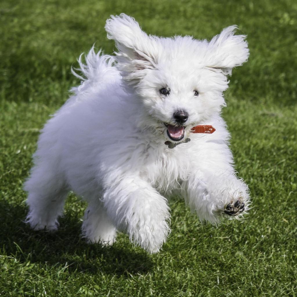 » Wallpaper Happy dog breed Bichon Frise runs across the lawn