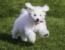 Wallpaper Dog breed Bichon Frise lies on the lawn with a ball