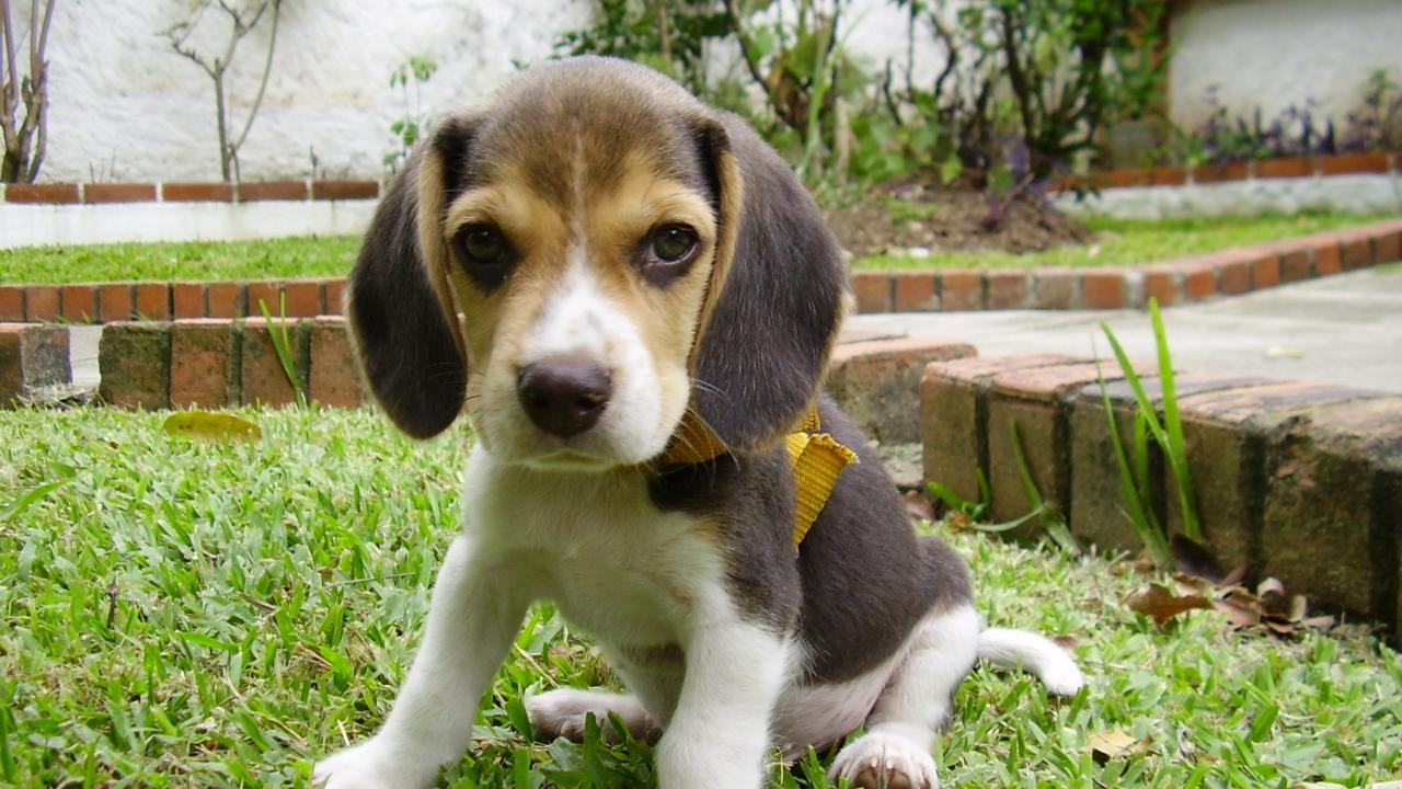 Wallpaper Sad beagle puppy in a red wheelbarrow
