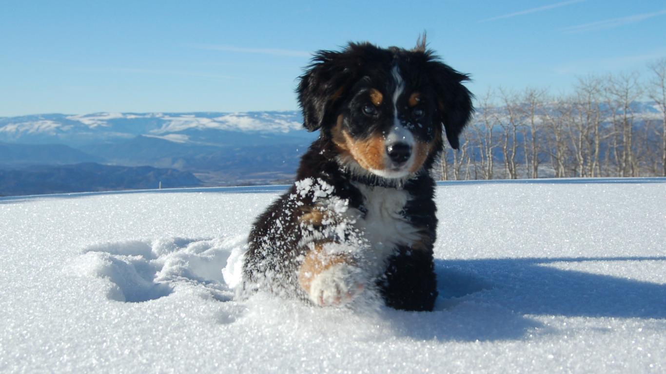 Wallpaper Bernese Mountain dog puppy in a snowdrift