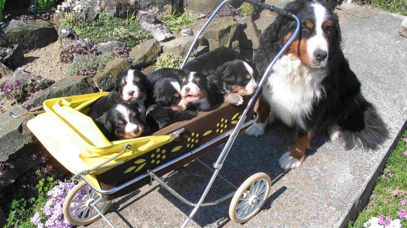 Wallpaper Happy Mountain dog puppies Bernese with mom