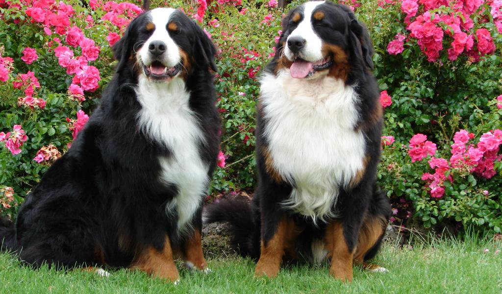 Wallpaper Bernese Mountain Dogs on a background of bushes