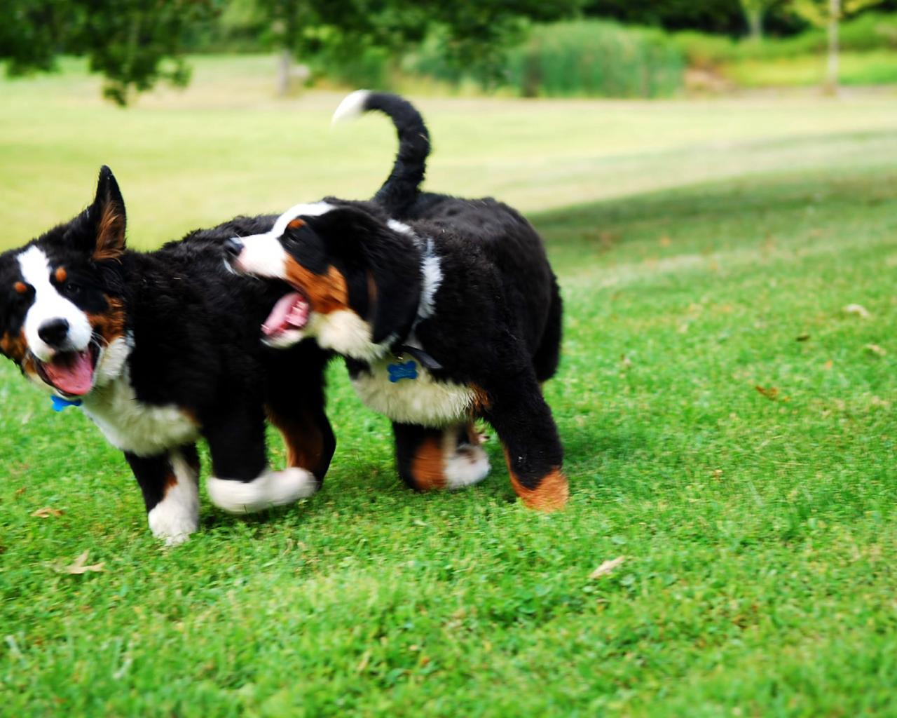 Wallpaper Two puppies Bernese Mountain dog playing on grass