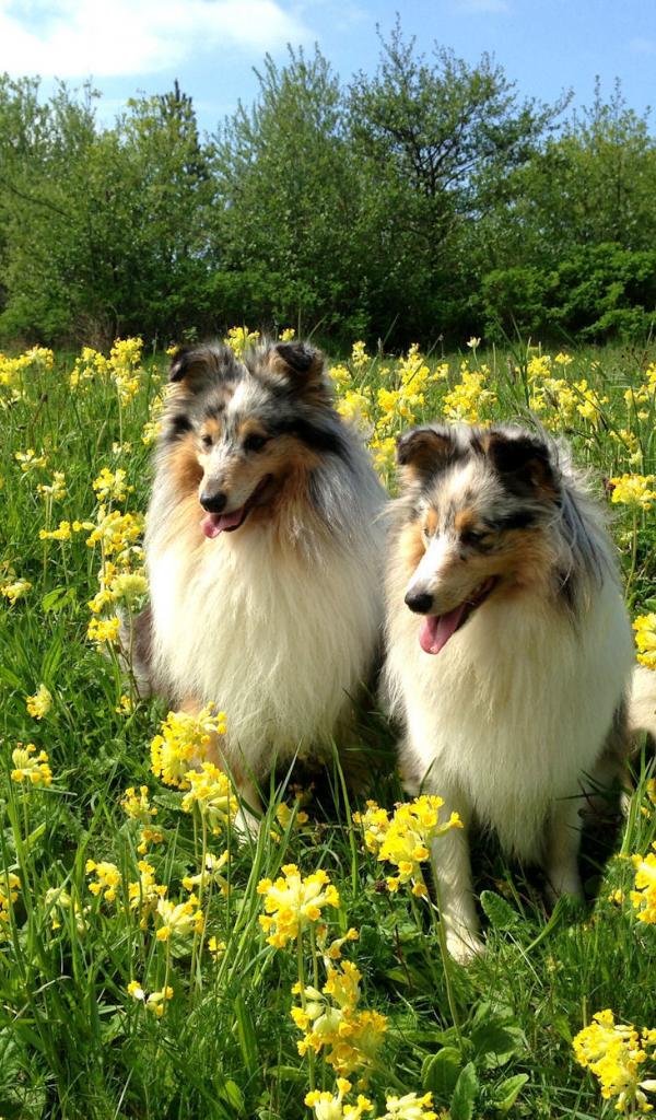 Wallpaper Two beautiful Sheltie breed dog in flowers