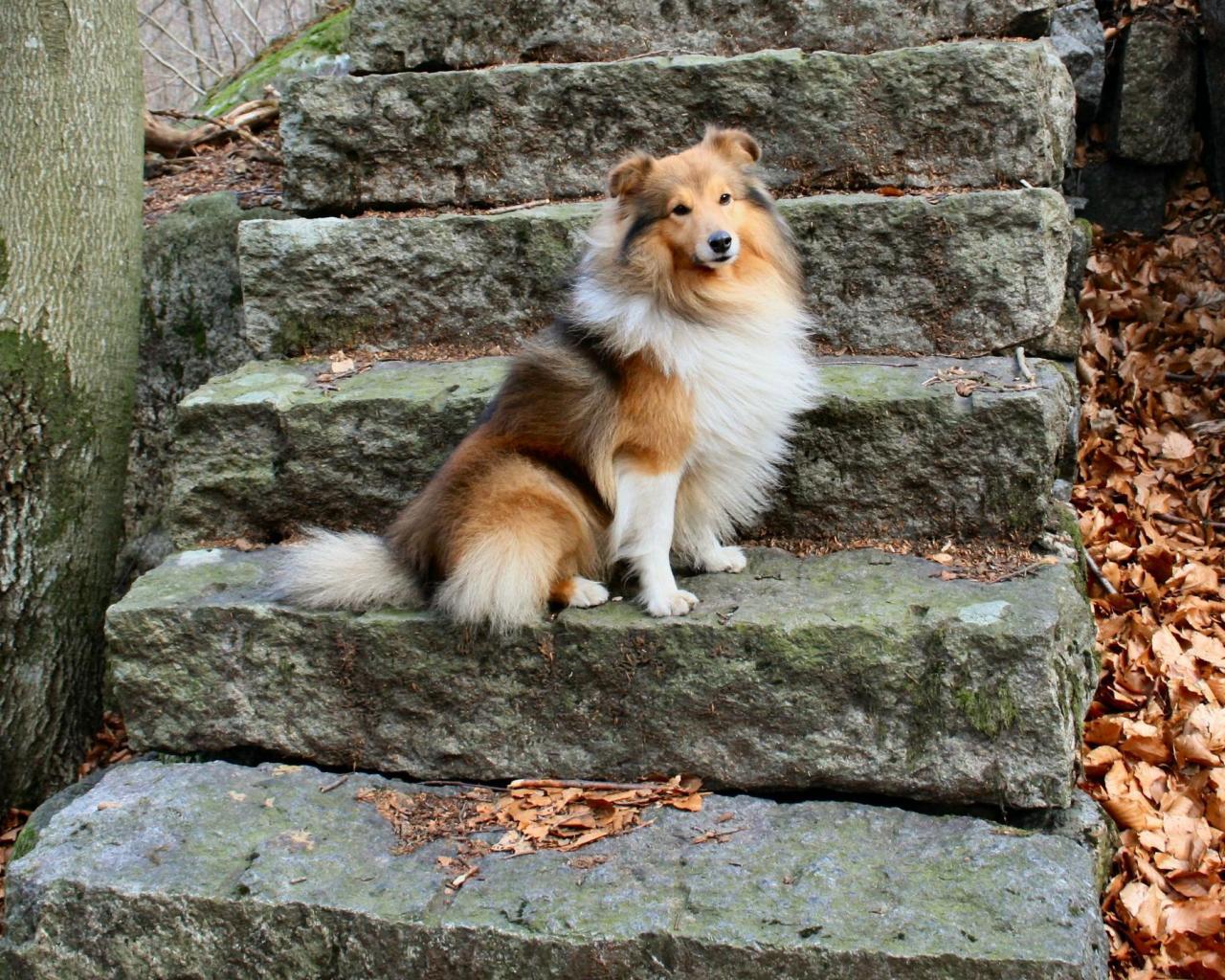 Wallpaper Sheltie breed dog posing on the stairs