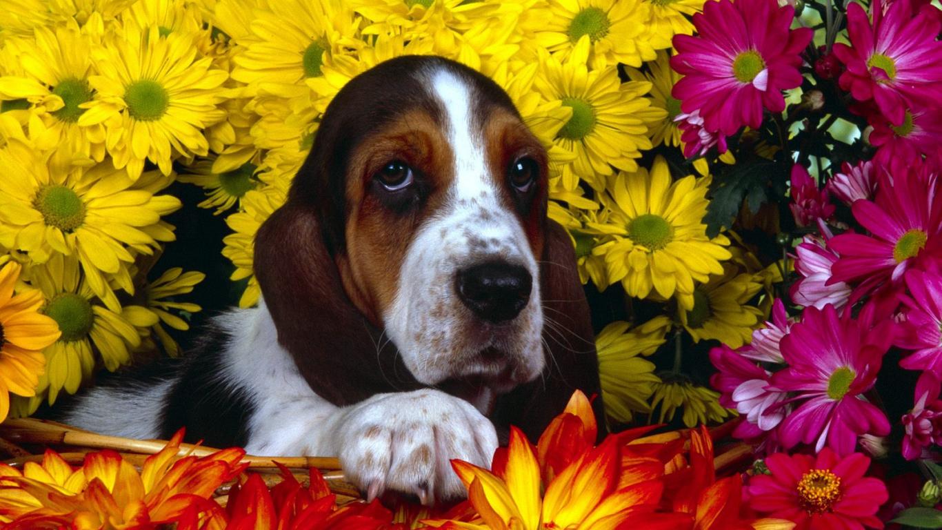 » Wallpaper Young basset hound in flowers