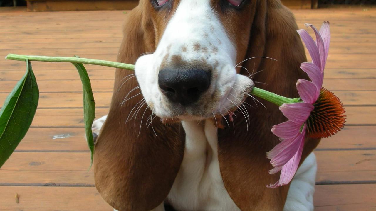 Wallpaper A Basset Hound gives a flower
