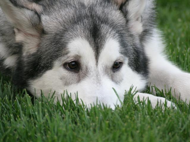 Wallpaper The Alaskan Malamute is sad lying on the grass