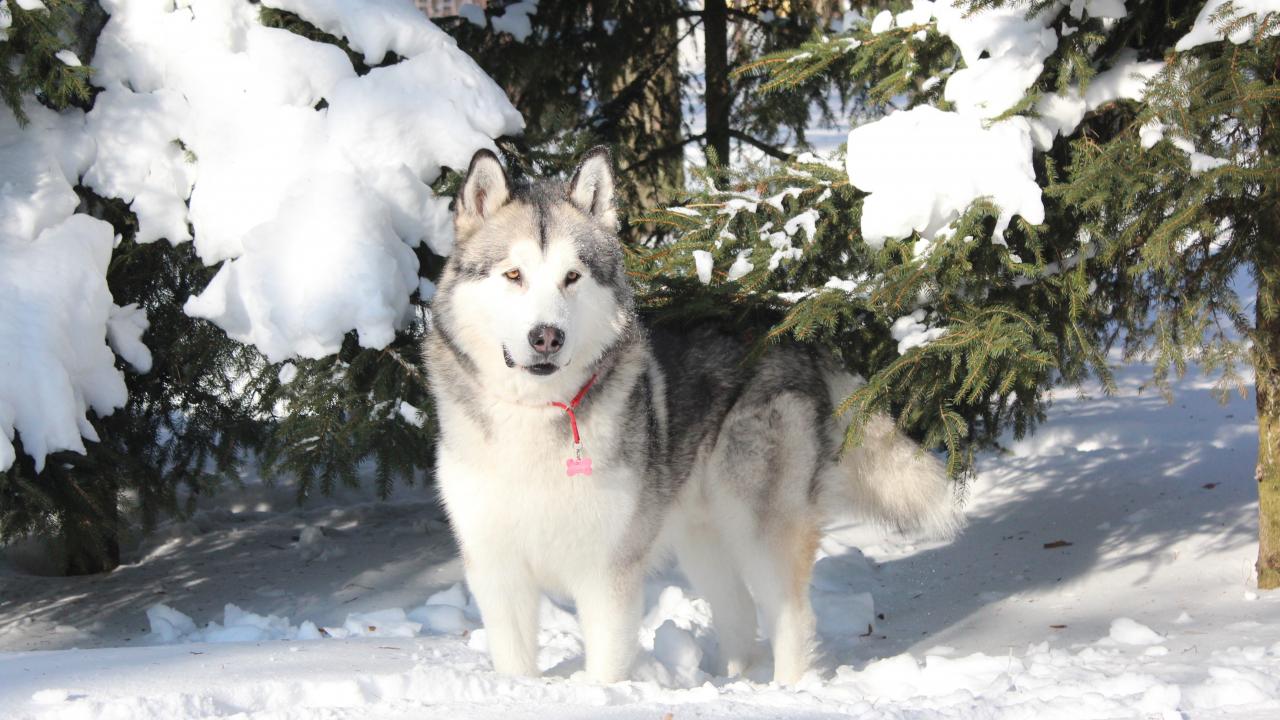 Wallpaper Beautiful Alaskan Malamute stands in the snow