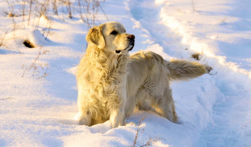 Wallpaper Golden terrier is sitting on the snow in the forest