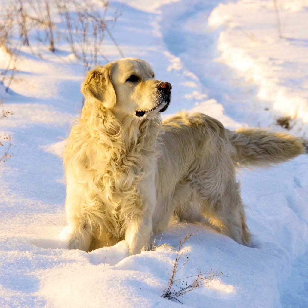 Wallpaper Golden terrier is sitting on the snow in the forest