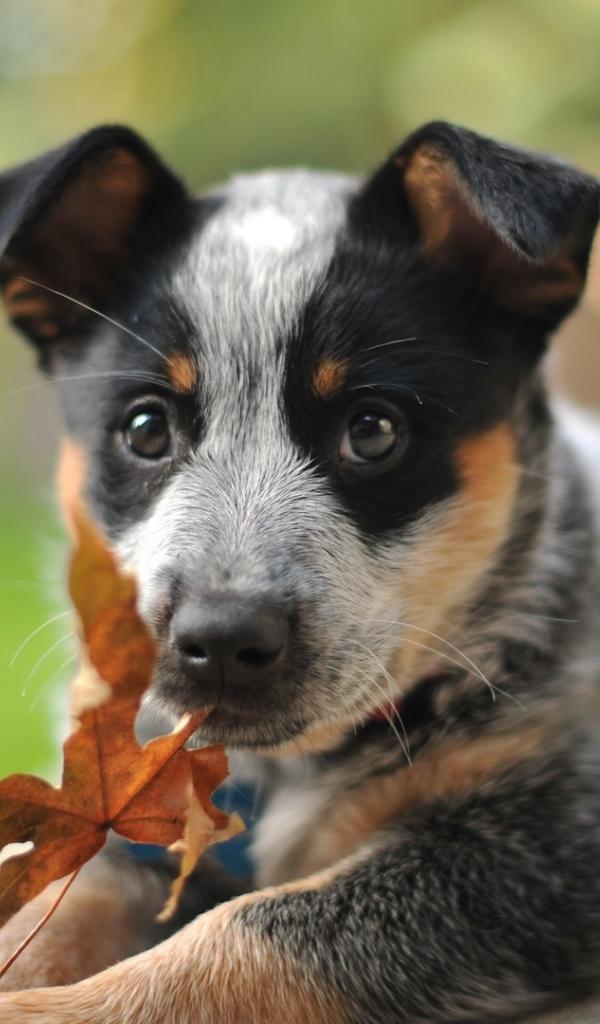 Wallpaper Australian shepherd puppy and autumn leaf
