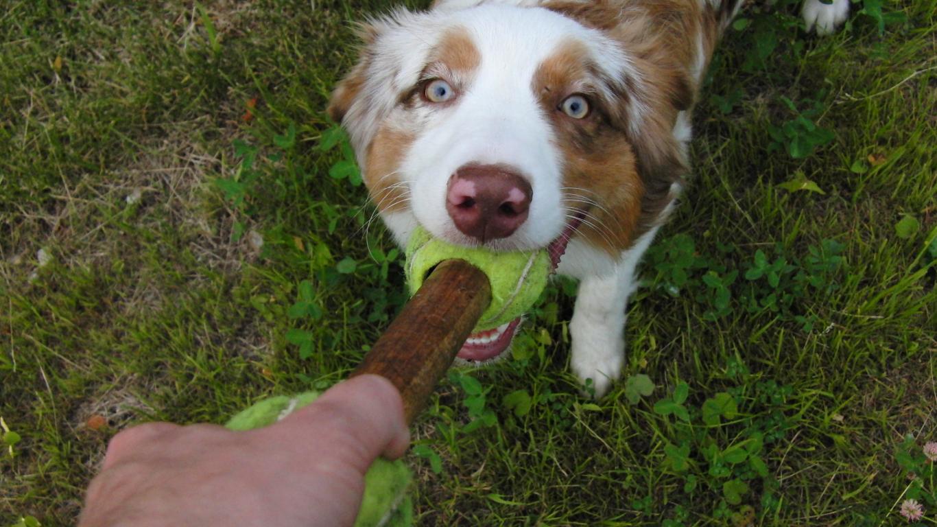 Wallpaper Australian Shepherd playing with a host