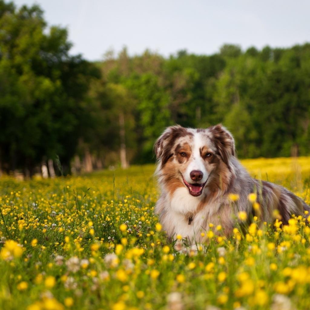 Wallpaper Australian Shepherd in dandelions