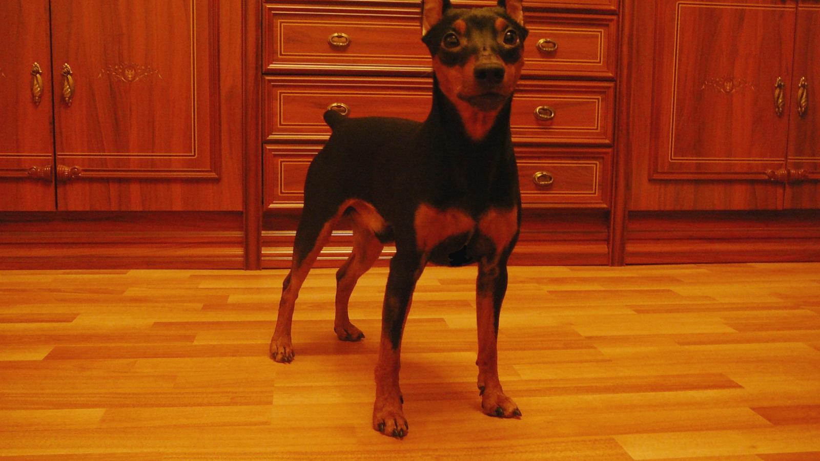 Wallpaper Sleepy Miniature Pinscher in the bed