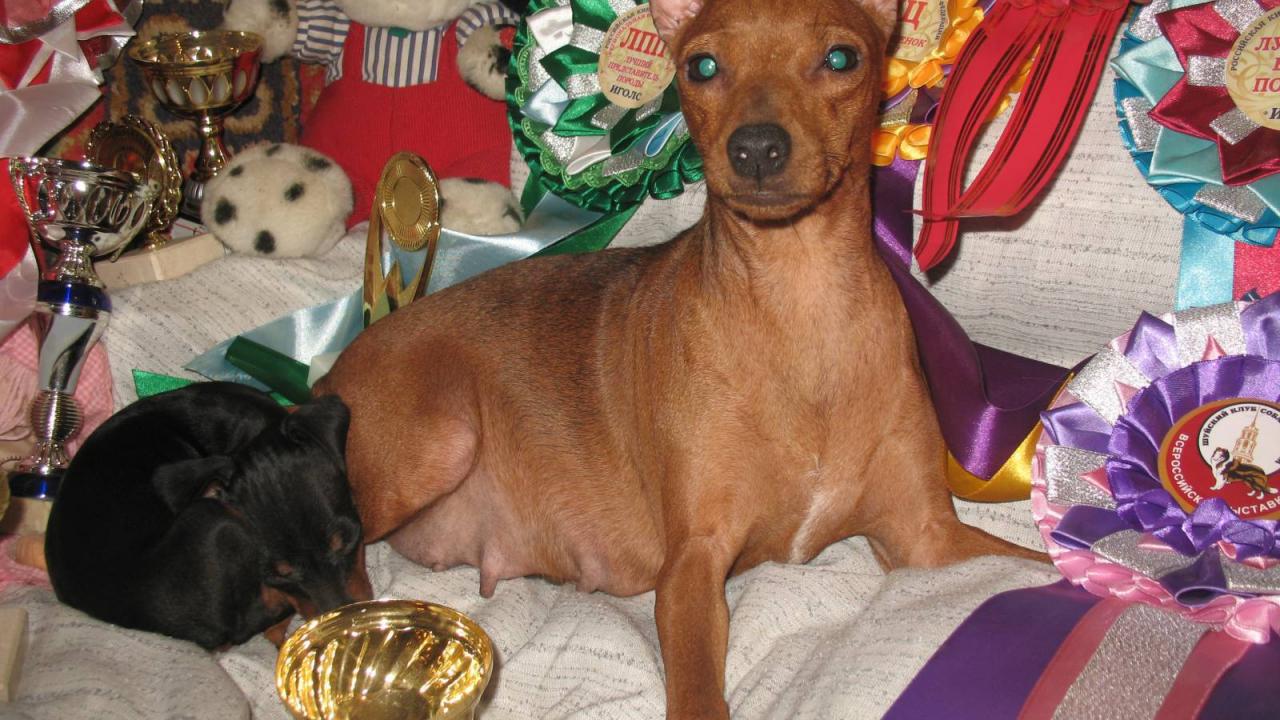 Wallpaper Miniature Pinscher and his prizes on the bed