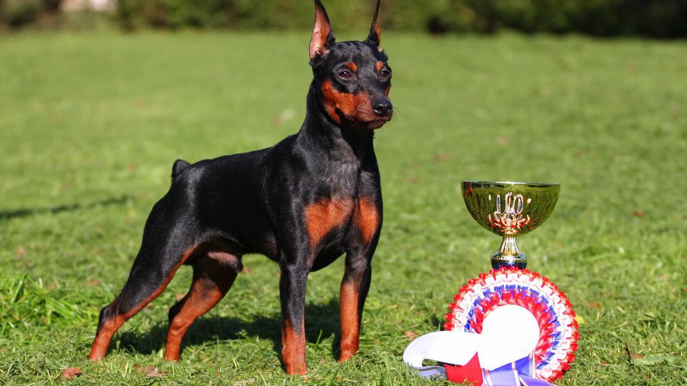 Wallpaper Miniature Pinscher and his prizes on the bed