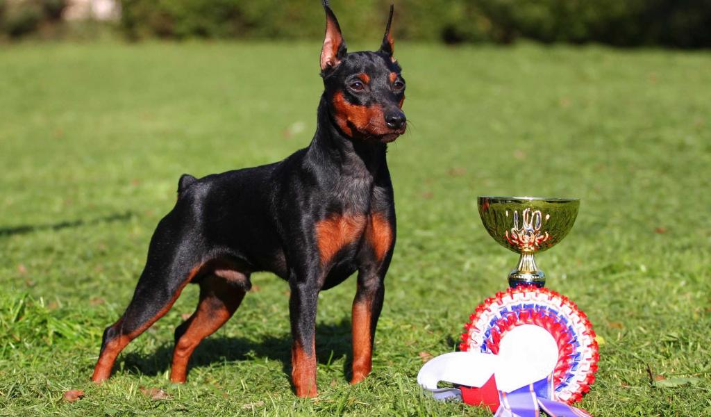 Wallpaper Miniature Pinscher and his prizes on the bed