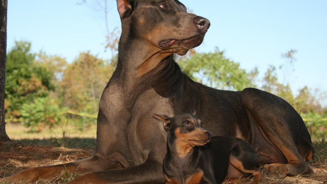 Wallpaper Dobermans lying on the leaves