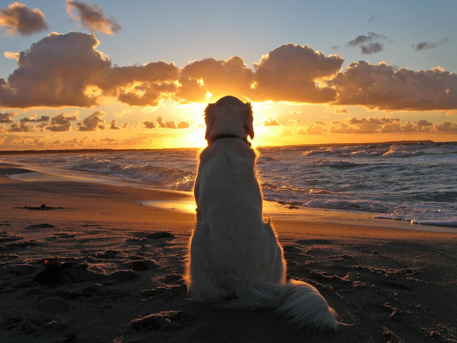 Wallpaper White dog looks at the sunset