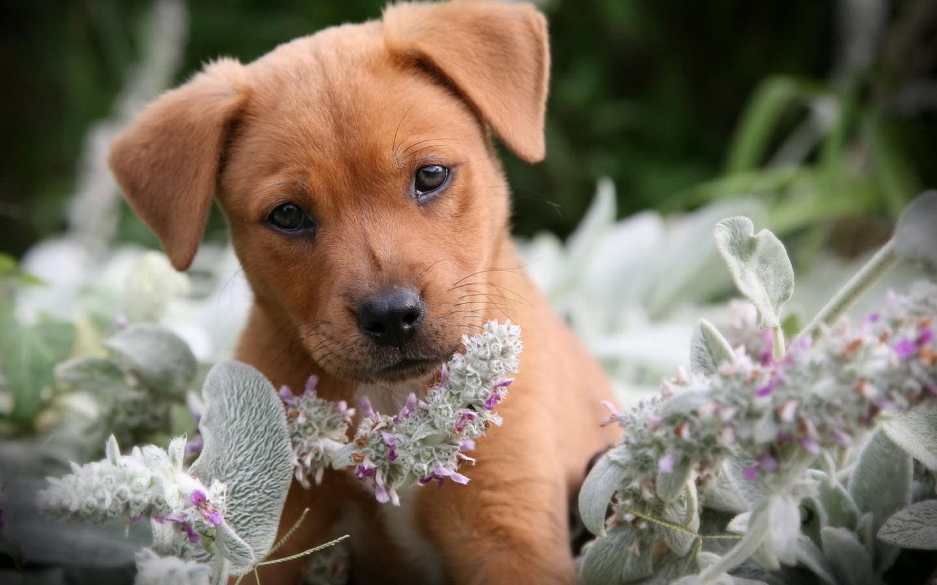 Wallpaper Sad puppy smells the flowers