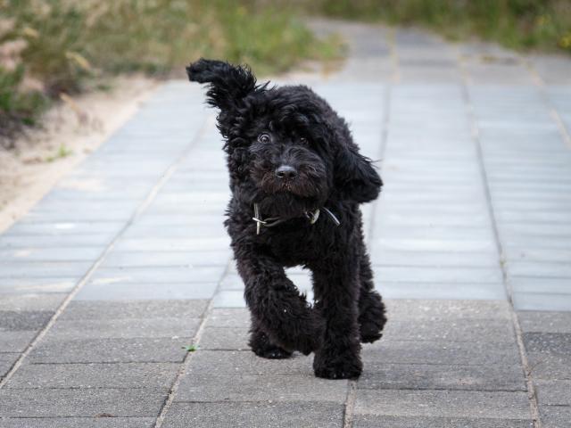 Wallpaper Barbet dog running down the sidewalk