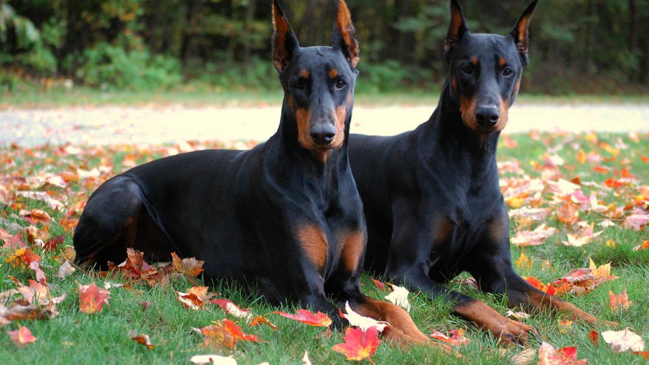 » Wallpaper Two Doberman in autumn park