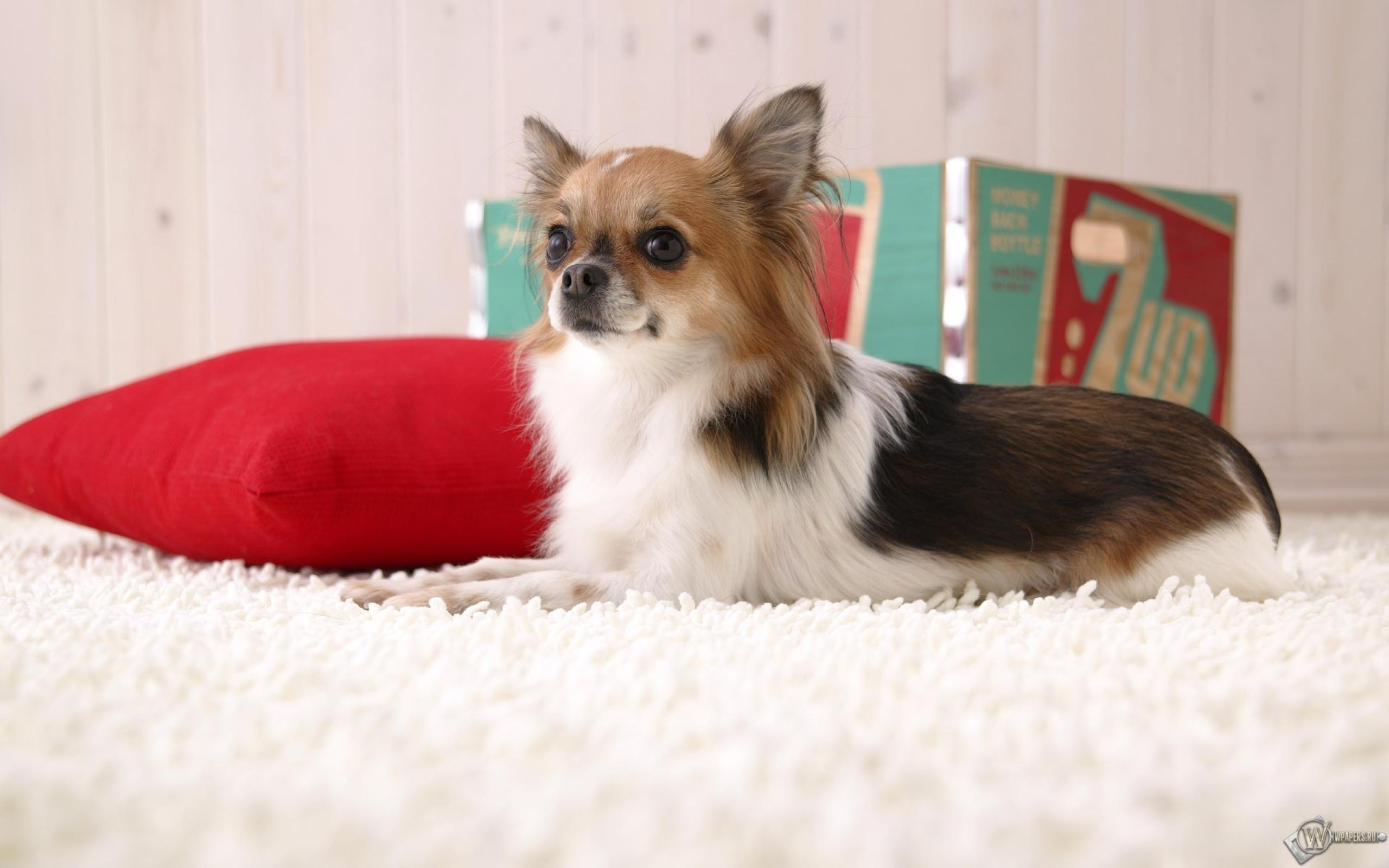 Wallpaper Fluffy chihuahua on a red cushion
