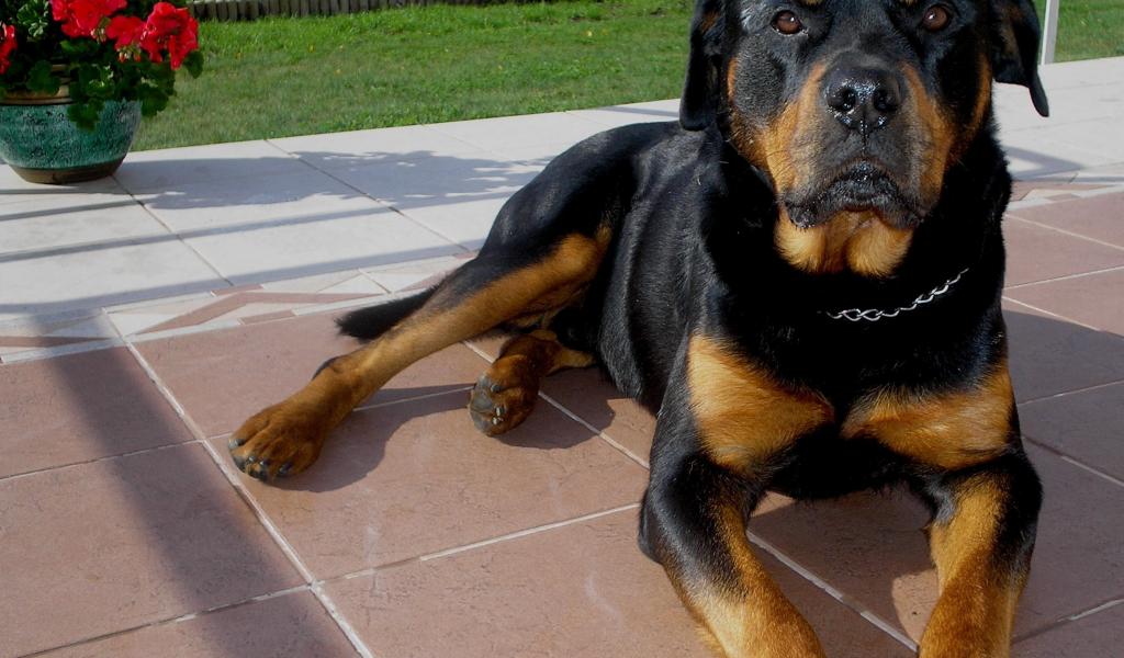 » Wallpaper Rottweiler lying on the porch