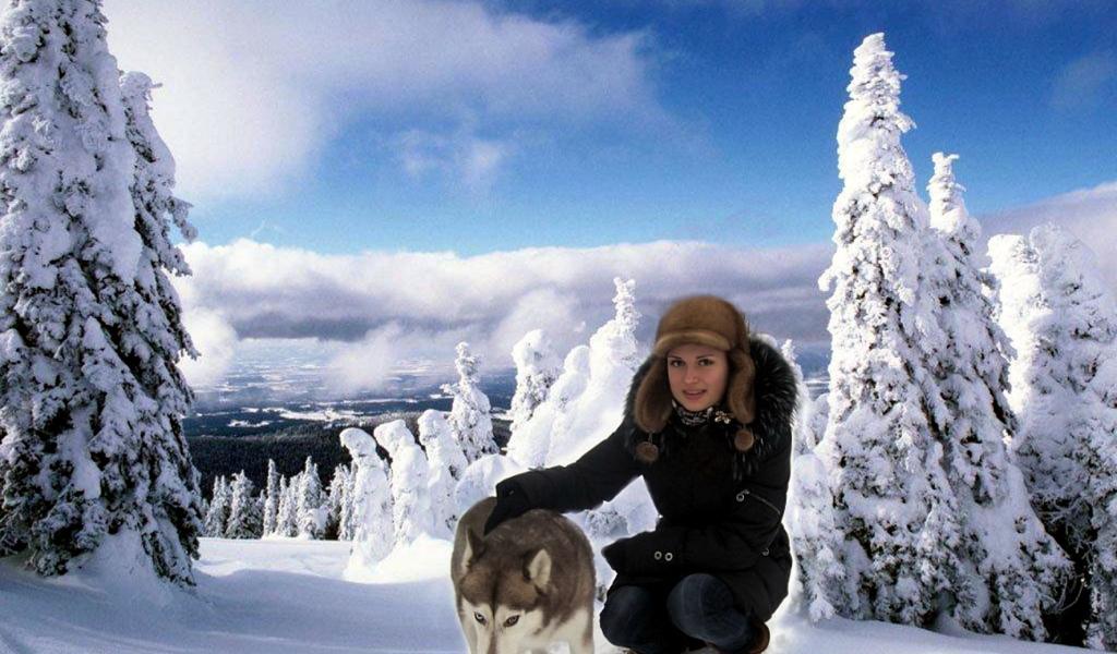 Wallpaper Red-haired girl in a hat husky puppy caresses