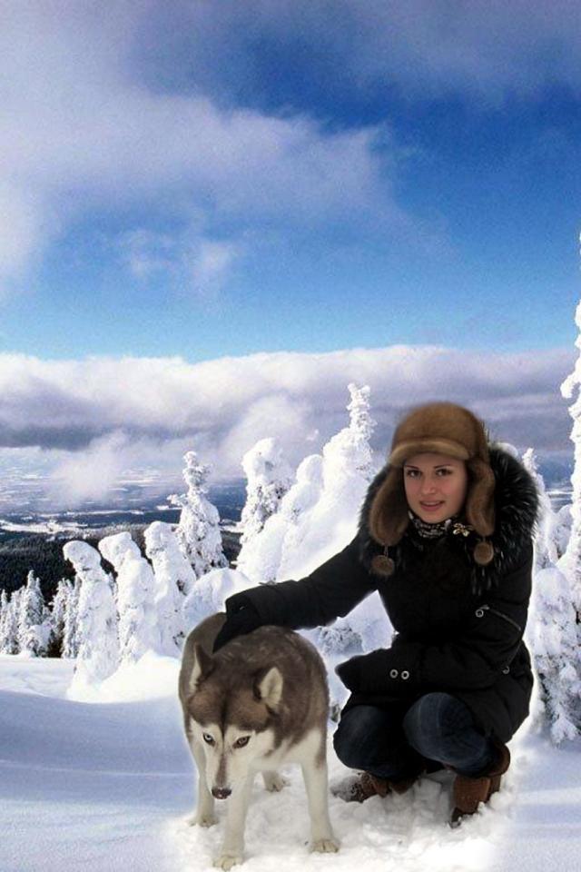 Wallpaper Red-haired girl in a hat husky puppy caresses