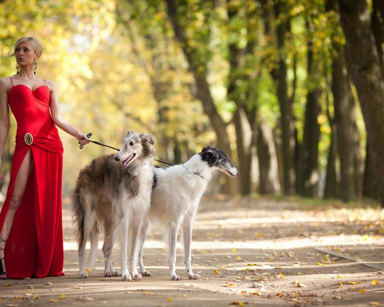 Wallpaper Girl in red with greyhounds