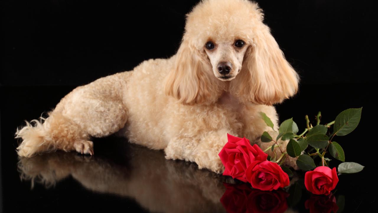 Wallpaper Poodle with a bouquet of roses