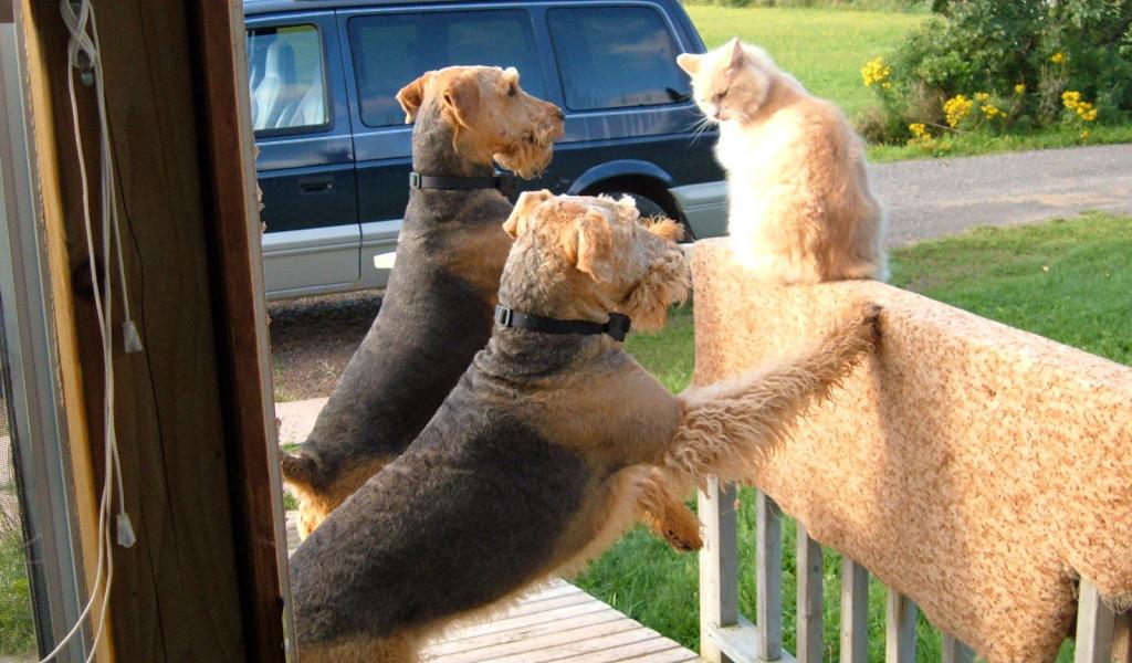 » Wallpaper Two Airedale stick to the cat